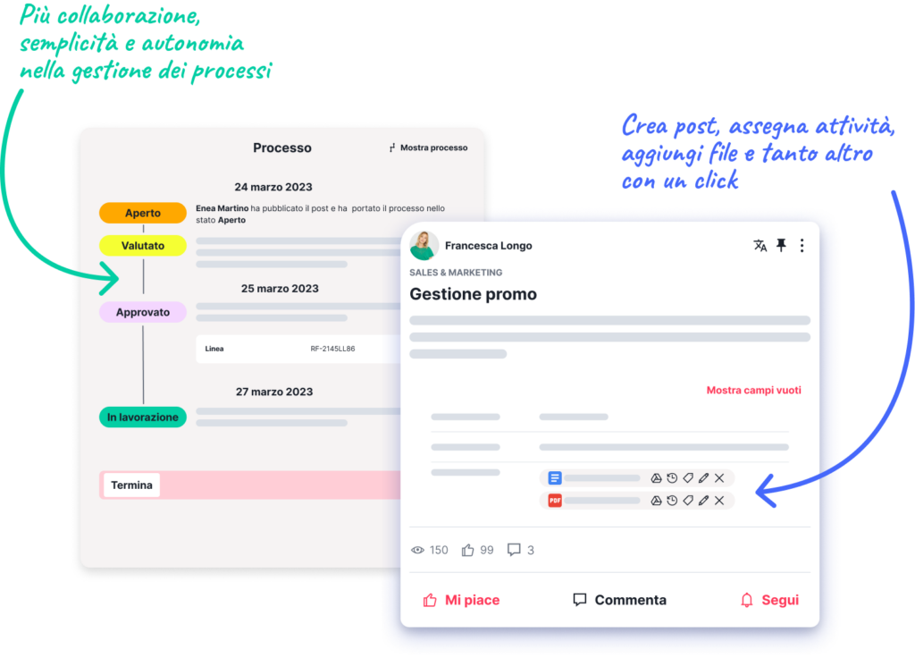 Enjoy effortless process management and interact with co-workers via posts, mentions and comments.